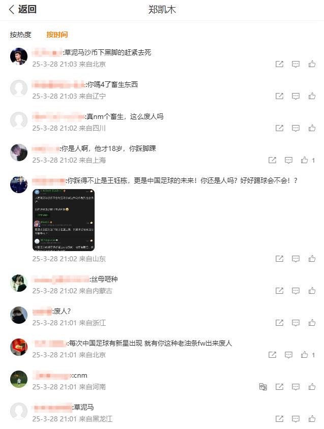 在这样的情况下郑凯木的个人微博便成为了球迷泄愤的场所,他在1月3日发布的一条评论区已经遭到了大量的辱骂。